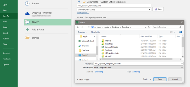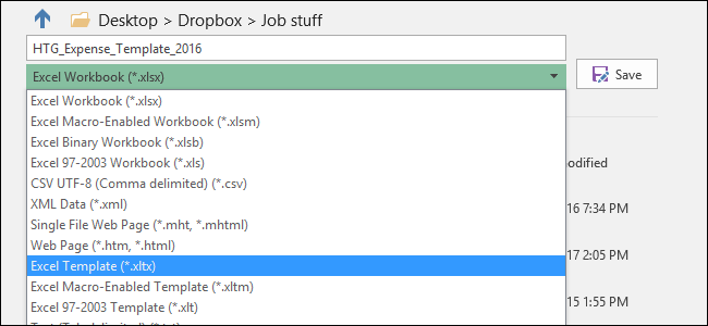 In the file type dropdown (just underneath the file name text box), select the “Excel Template (.xltx)” option.