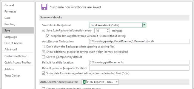 If you want an even more organized approach, you can change the default location where Excel saves templates. On the “File” menu, click the “Options” command. In the “Excel Options” window, click the “Save” category in the left column.